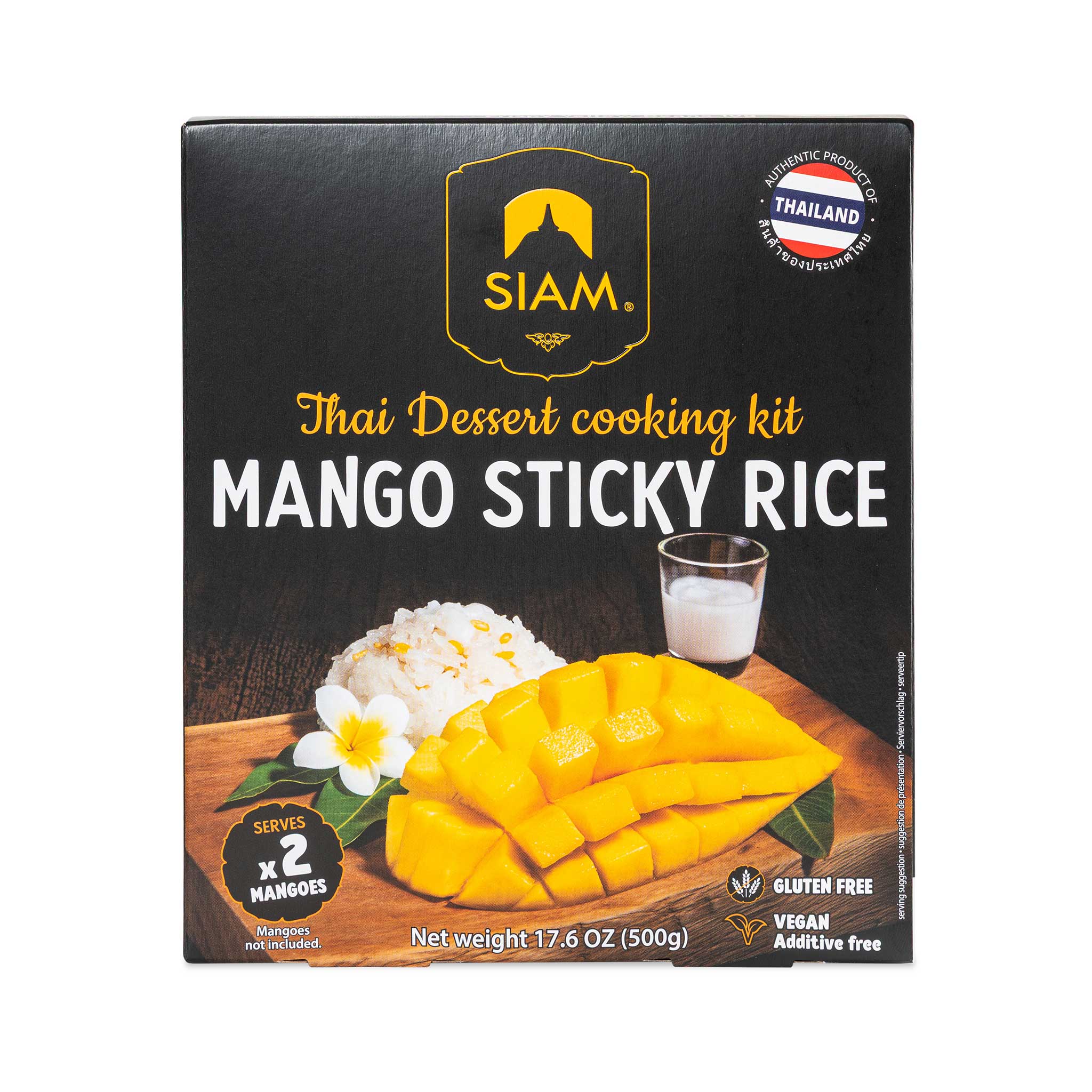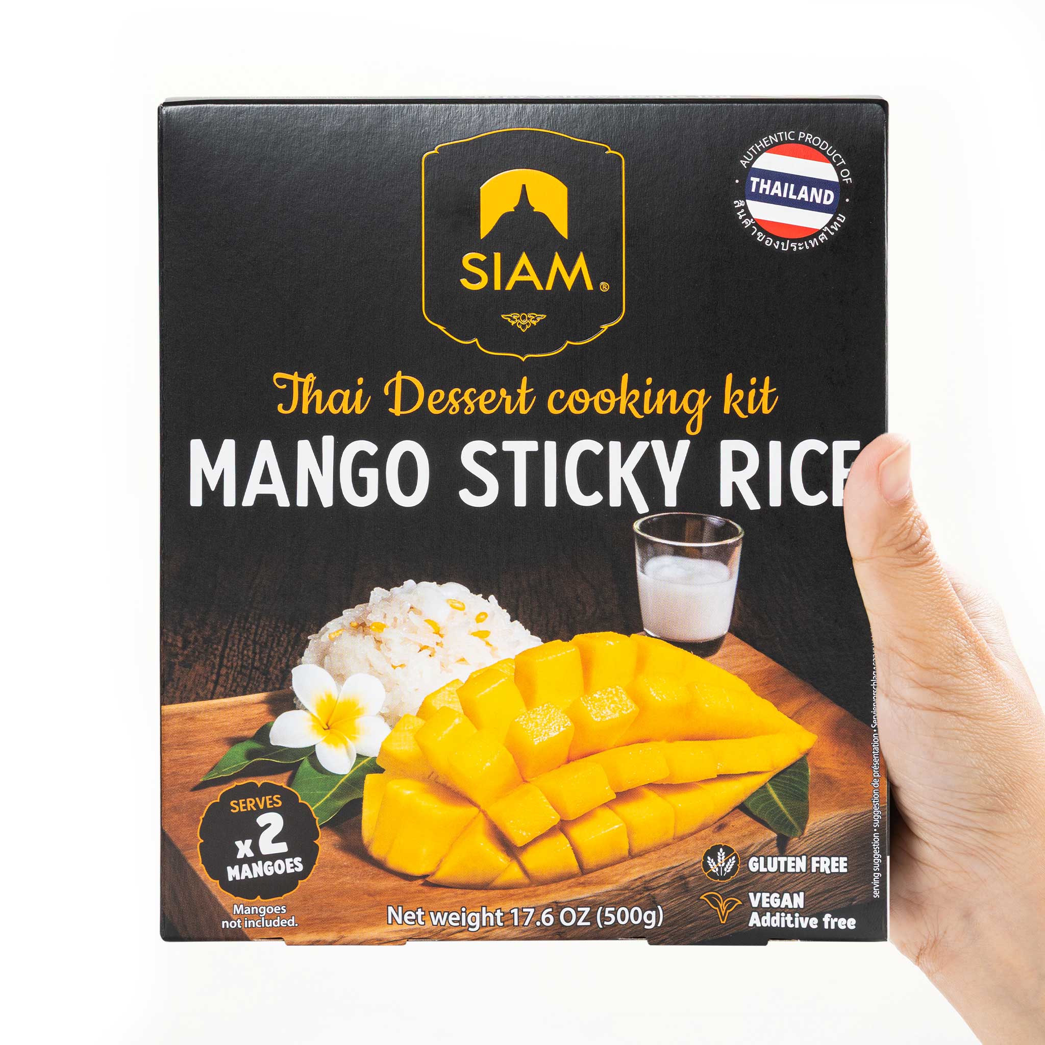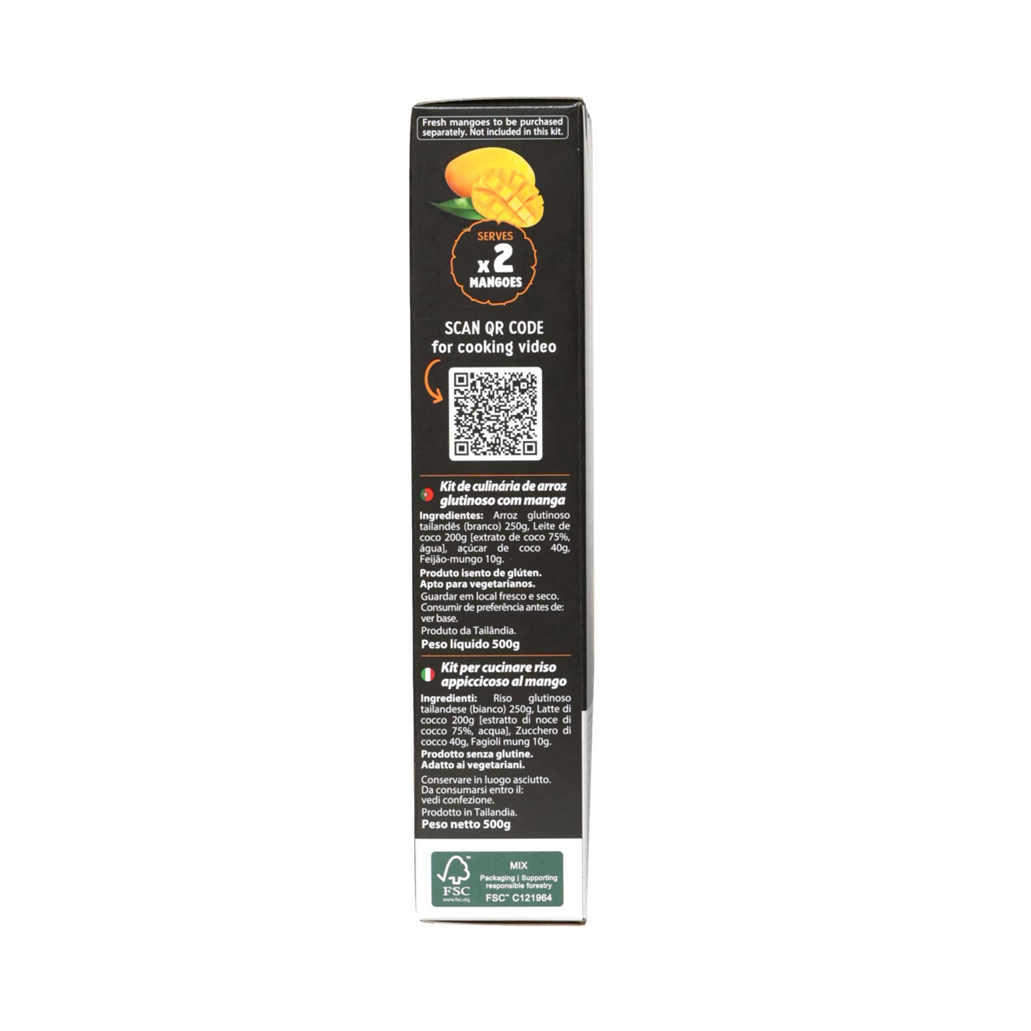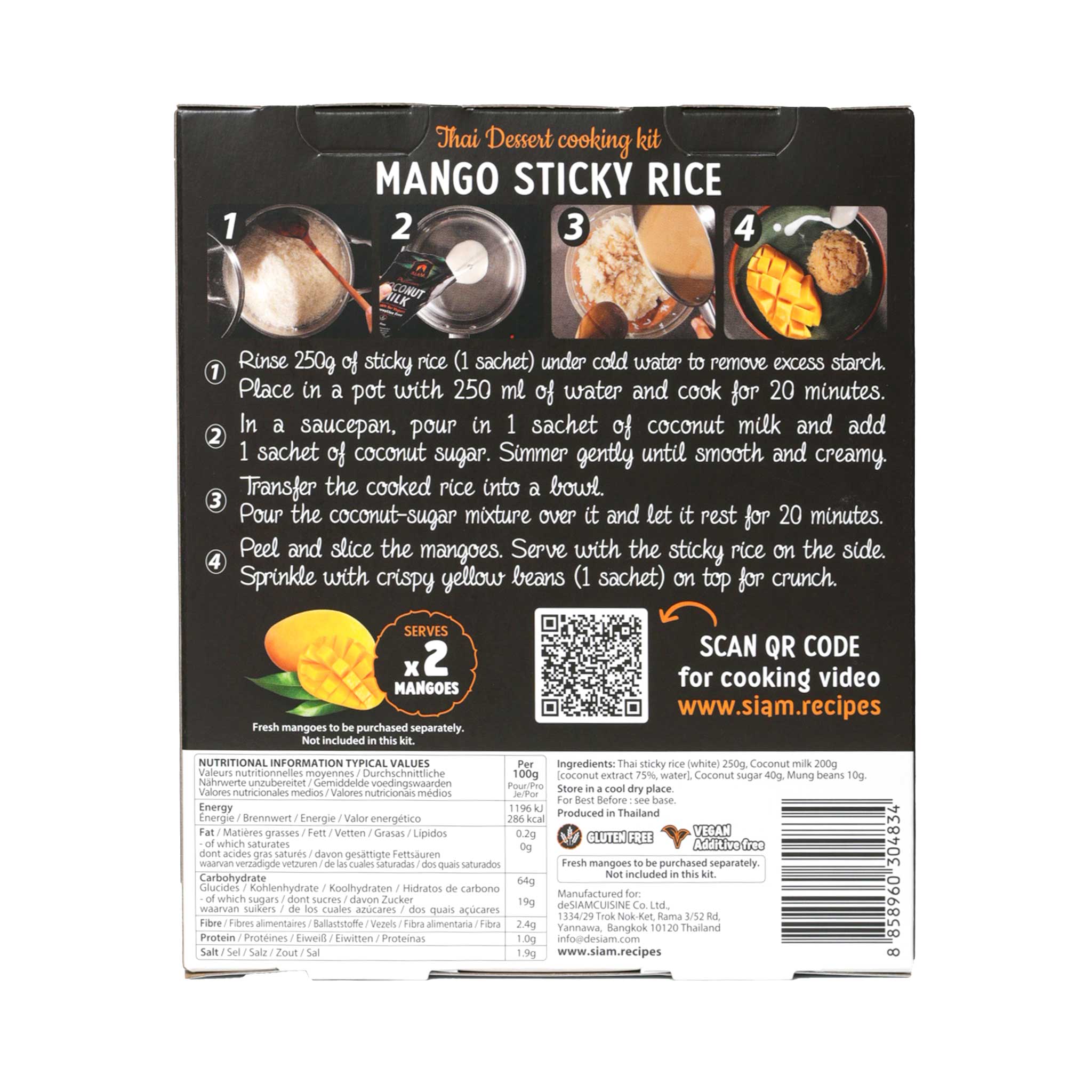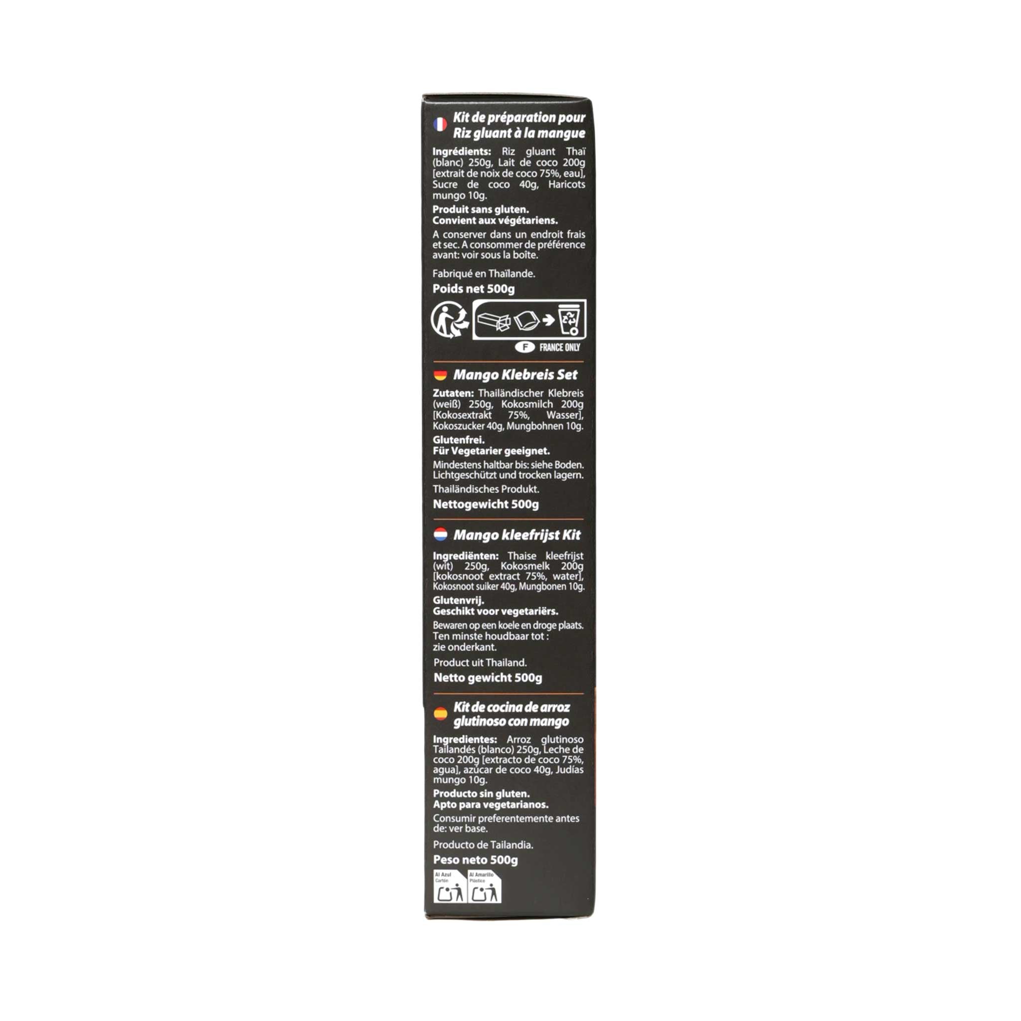 Ingredienti: Riso Thai Sticky (bianco) 250 g, latte di cocco 200 g [estratto di cocco (cocco, acqua) 75,00%, acqua], zucchero di cocco 40 g, fagioli mung 10 g.